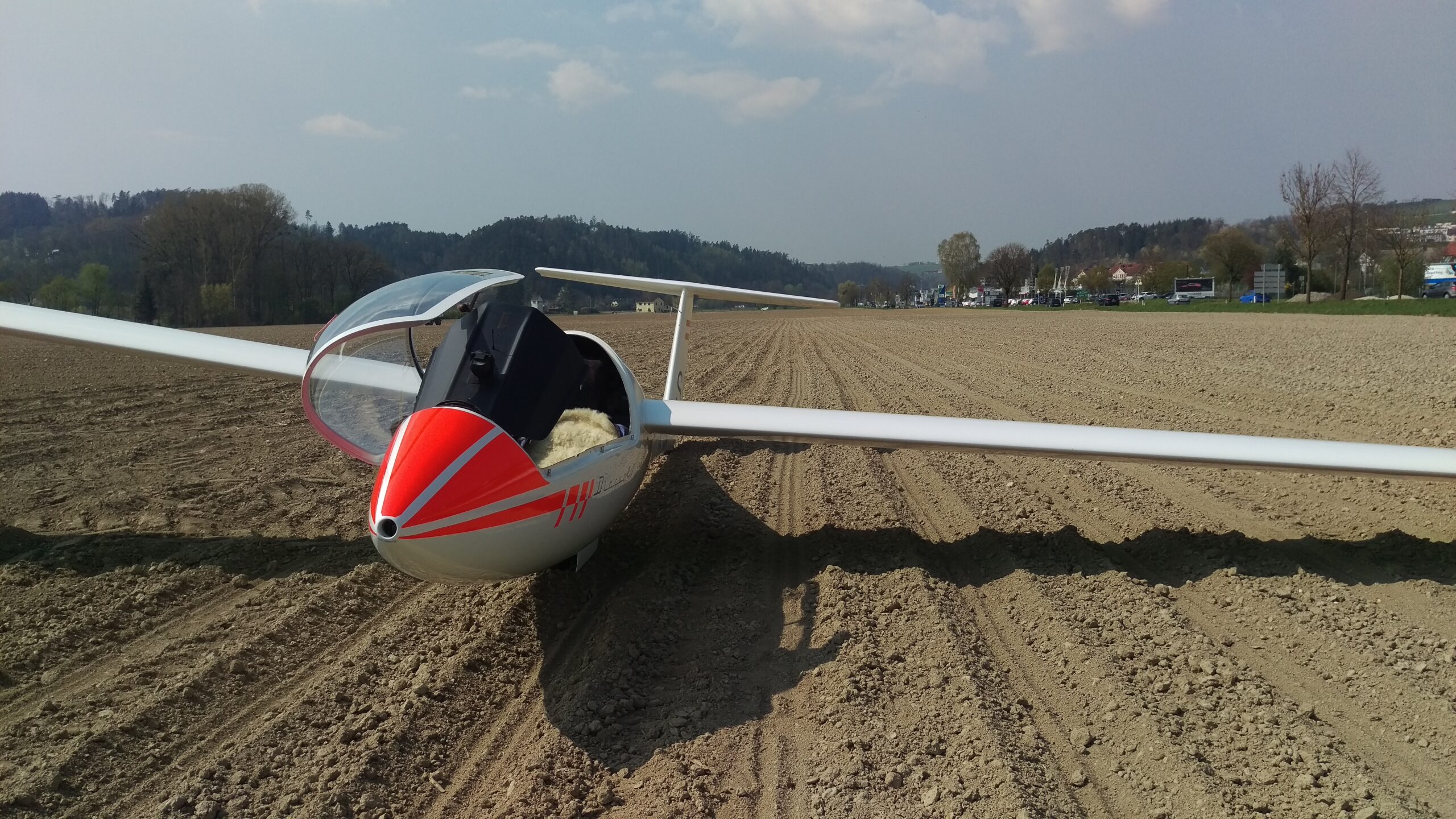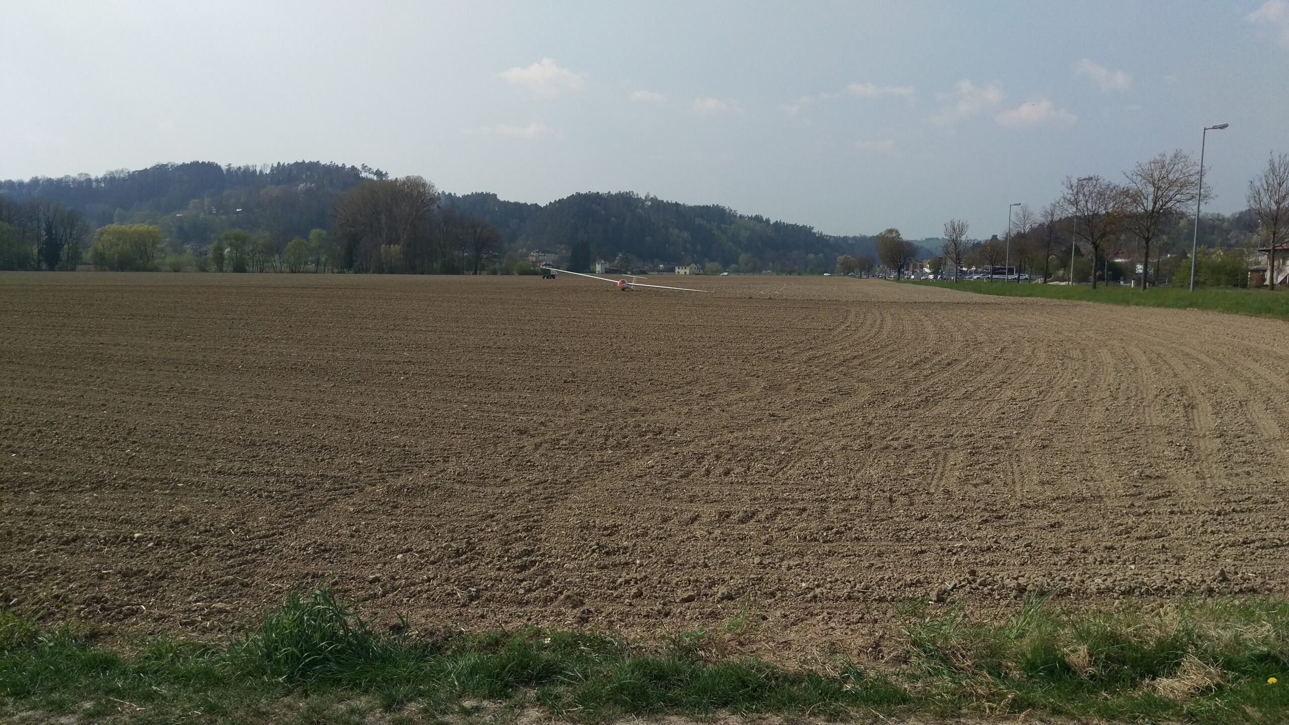 Nach ein paar Suchkreisen war klar, dass eine Außenlandung nicht mehr zu vermeiden ist. Während dem Abgleiten zu meiner aktuellen Position habe ich schon mehrere potentielle Landefelder ausgesucht und diese im Gedächtnis behalten. Eine gefiel mir besonders gut. Ein Feld mit Spuren parallel zur Straße, das frisch bearbeitet aussah. Da sinkt dann schon mal die Wahrscheinlichkeit, dass im Feld irgendein Hindernis versteckt ist, sonst würde man das ja an den Spuren sehen. Außerdem kannte ich das Feld, weil ich des öfteren daran vorbeigefahren bin und aus Erzählungen wusste, dass hier schon einige vor mir gelandet sind. Zur Sicherheit bin ich trotzdem nochmal über das Feld geflogen und habe versucht irgendetwas ungewöhnliches zu entdecken. Alles sah gut aus, also nach Rechts abgedreht in den Gegenanflug. Eine Baumgruppe, die ich auch hätte überfliegen können habe ich zugunsten einer erhöhten Anfluggeschwindigkeit auf deren linken Seite passiert. Der Queranflug wurde durch eine größere Rechtskurve in den Endanflug ersetzt. Dieser ist angenehm lang ausgefallen und ich konnte in Ruhe auf meinen Landepunkt zielen, den ich auch gut erwischt habe. Um 14:15 LT stand der Flieger nach ca. 170m Ausrollstrecke.