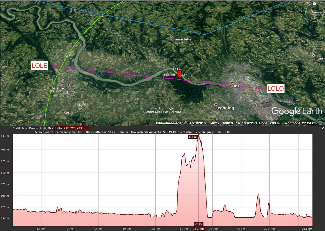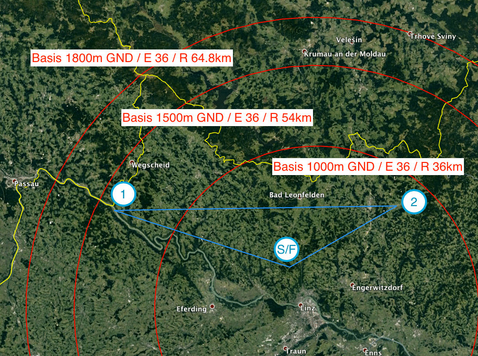 In der Abbildung zeigen die grünen Kreise die berechneten Gleitwinkel mit Sicherheitshöhe und die roten Kreise die ohne Sicherheitshöhe. Mit 1000m über LOLE war ich somit sogar knapp außerhalb des Gleitwinkelbereichs. Mit diesen Informationen in meiner Karte hätte ich vielleicht anders entschieden. Berücksichtigt man jetzt noch das ansteigende Gelände und die Stadt auf der direkten Strecke zwischen LOLE und LOLO möchte man fast nochmal 100m Sicherheitshöhe dazurechnen.